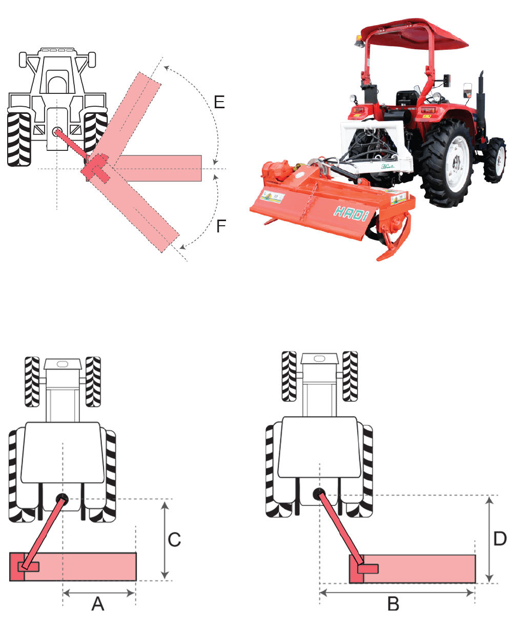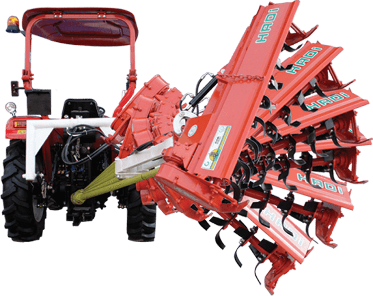 Using its hydraulic arms stretching to the right side of tractor, this new tillage equipment is capable of tilling the soil and uprooting weeds under trees in steep lands with a slope of - 45 ° and on hills with a slope of +70°. The device is designed and manufactured in different models for different types of tractors.